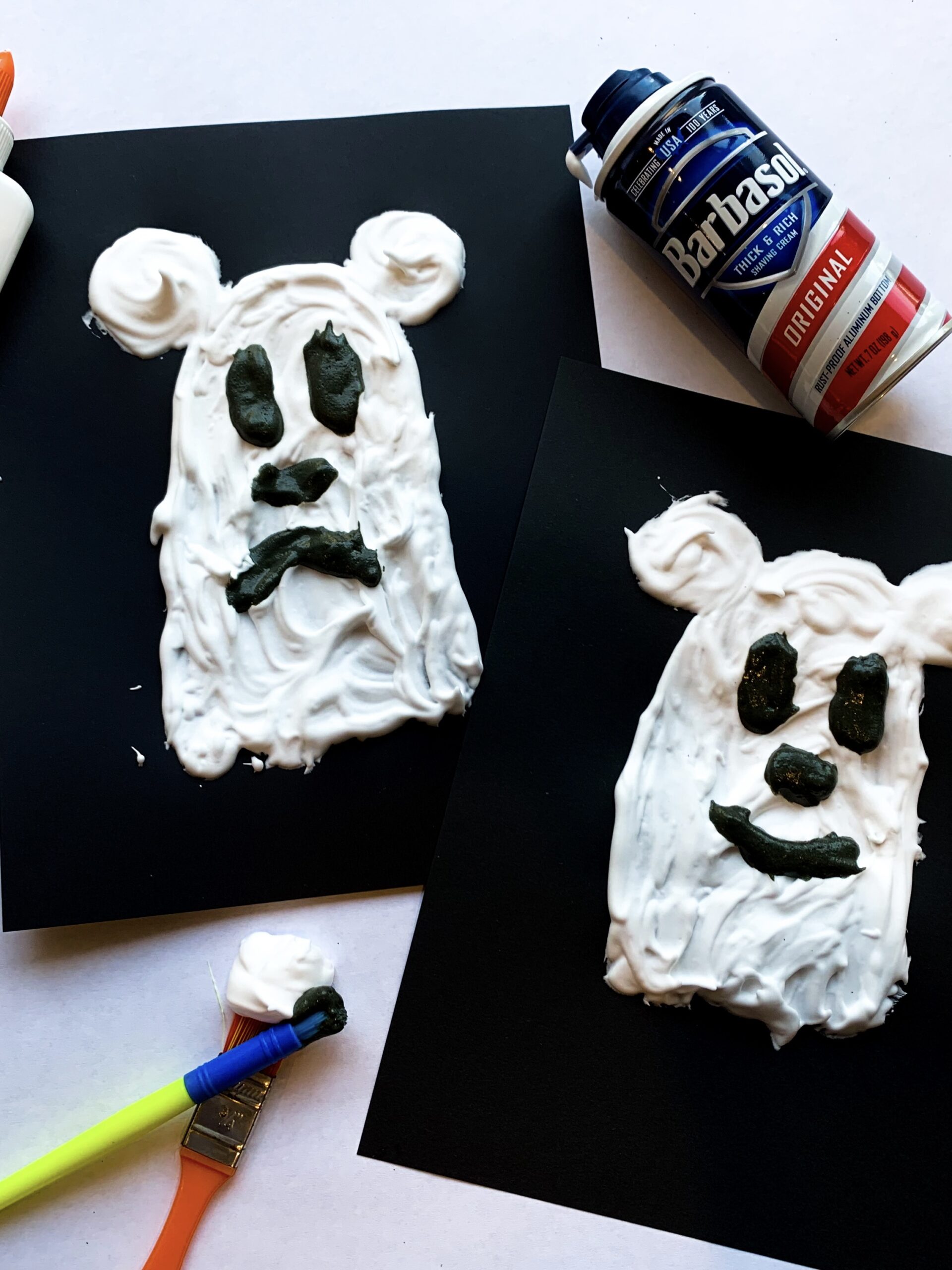 - Using the black shaving cream mixture paint a face on the ghost.